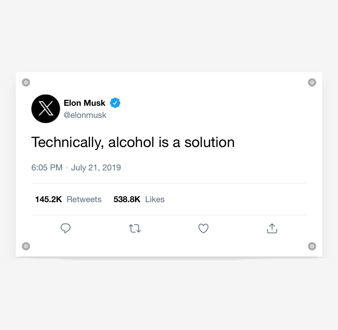 Introducing the "Technically Alcohol is a Solution" flag, inspired by a tweet from the legendary Elon Musk! 🚩🍻 This flag is perfect for those who appreciate a clever play on words and a touch of scientific humor. Hang it up and let everyone know that you're a fan of both chemistry and a good time! 🎉🔬
