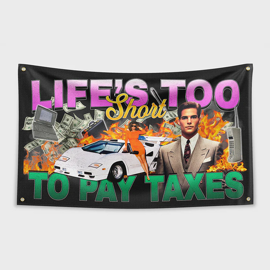 โLifeโs Too Short to Pay Taxesโ Retro Meme Flag โ 80s Aesthetic Wall Banner for Dorms, Game Rooms & Man Caves Bring over-the-top retro energy into your space with the โLifeโs Too Short to Pay Taxesโ...Sale price $19.99Regular price $29.99 -