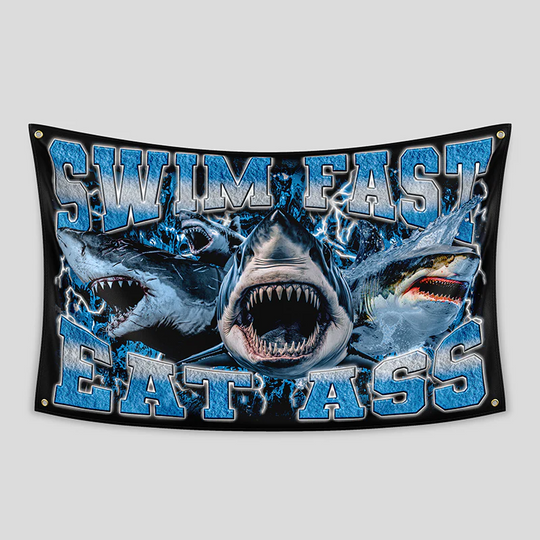 โSwim Fast Eat Assโ Shark Flag โ Funny Wall Banner for Dorms, Man Caves & Party Rooms Make a bold statement with the โSwim Fast Eat Assโ Shark Flag, featuring a chaotic trio of roaring great...Sale price $19.99Regular price $29.99 -