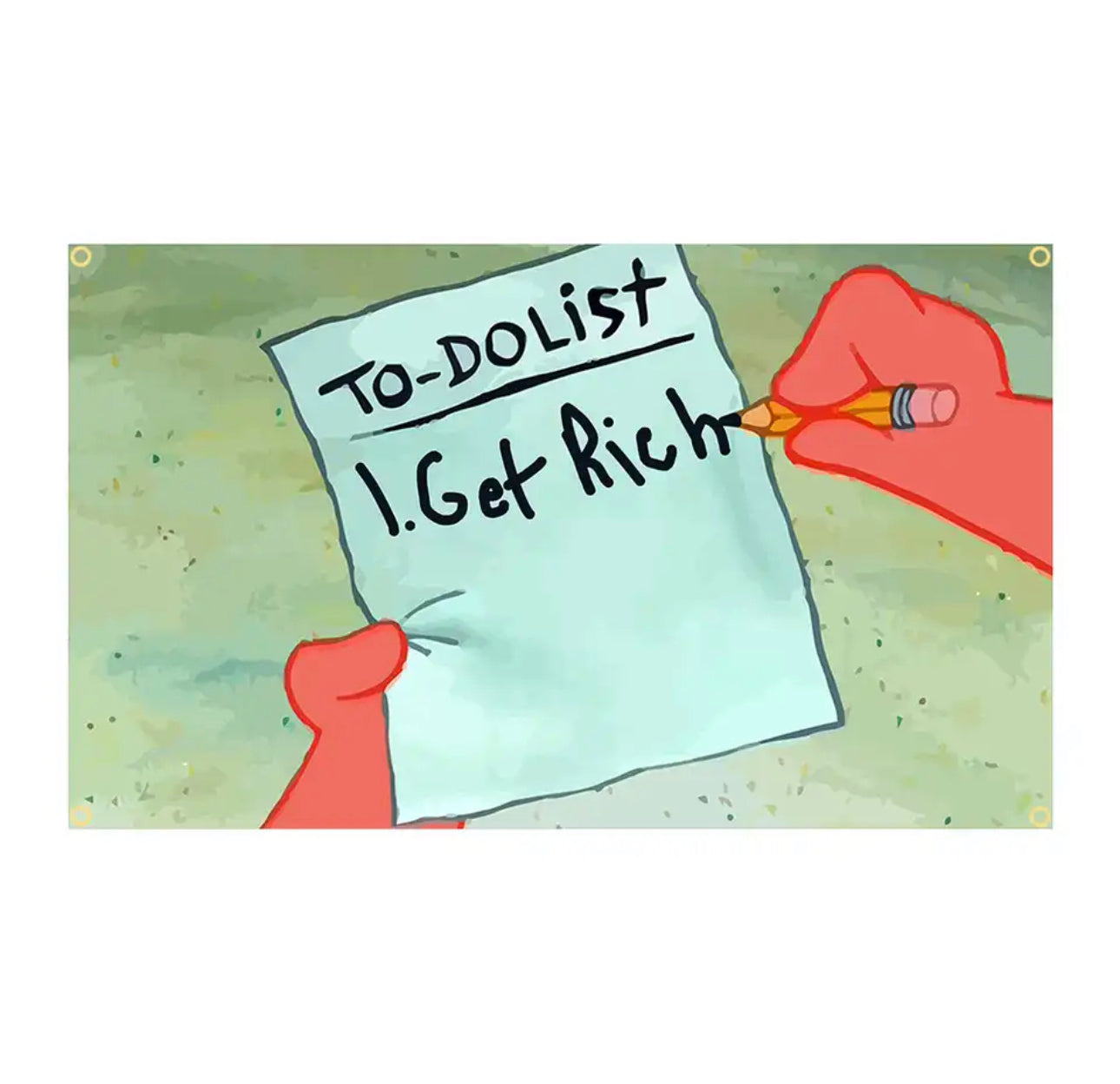 "To Do List: Get Rich Flag: Make your aspirations clear with this eye-catching flag featuring the empowering message 'To Do List: Get Rich.' Hang it up as a constant reminder to chase your dreams, work hard, and seize every opportunity that comes your way. Let this flag inspire you to take action, make smart financial decisions, and strive for the life of abundance you desire. It's time to turn those dreams into reality and write your own success story. Get motivated and start checking off those items on your path to wealth!"
