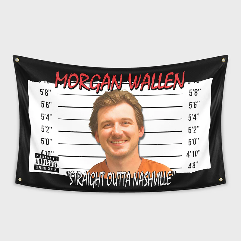 Bring bold country-music attitude to your space with this “Straight Outta Nashville” Mugshot-Style Flag, featuring a parody booking-photo design, height chart backdrop, and eye-catching red lettering. This banner blends humor, southern energy, and iconic country-culture aesthetics into one unforgettable piece of wall décor.