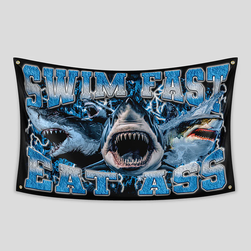 “Swim Fast Eat Ass” Shark Flag – Funny Wall Banner for Dorms, Man Caves & Party Rooms